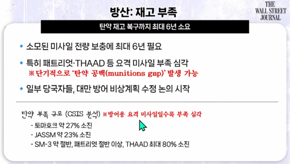 방산주 (K-방산의 기회): 미국과 NATO의 탄약 재고 부족이 심화되는 가운데, 한국이 세계적인 '탄약 공급기지' 및 '무기 체계 보완'의 핵심 파트너로 부상하고 있습니다.